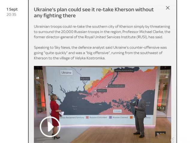 Skynews的军事评论员Michael Clark教授更加乐观,他认为乌军沿T0403号公路这条线可以兵不血刃,轻取诺瓦卡赫夫卡,迫使俄军主动放弃赫尔松市,退守第聂伯河以南。