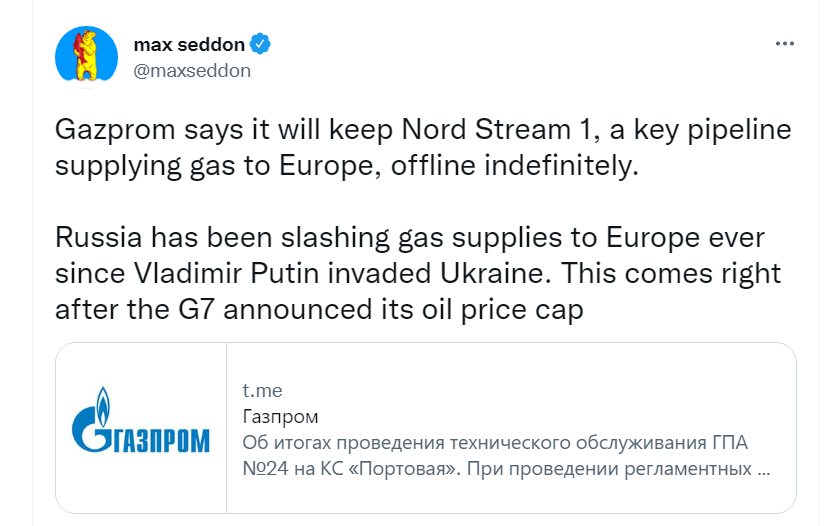 在战场之外,俄罗斯再次祭出能源武器,宣布北溪一号将无限期断气。