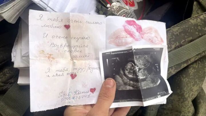 在一位俄军士兵的遗物中,有一封来自他怀孕的妻子的信,以及一张B超图。
