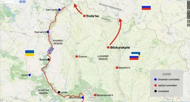 在奥斯基尔河北段,乌军渡河之后沿东岸进军,俄军则开始从Troitske和Bilokurakyne两地撤退到俄国境内。