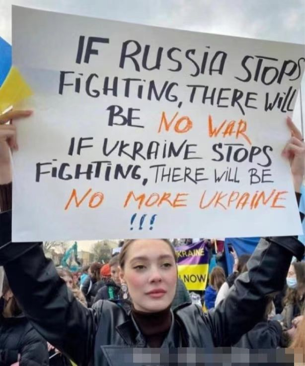 就像下图中这位乌克兰姑娘手中的标语那样,“如果俄罗斯停止战斗,就不会再有战争!“,”如果乌克兰停止战斗,就不会再有乌克兰!!!”,你让乌克兰人怎么停?