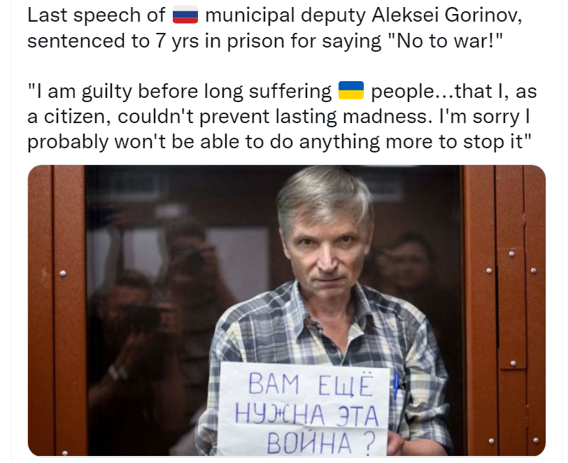 莫斯科议员 Aleksei Gorinov被判有期徒刑7年,在入狱前的最后一次讲话中,他说: