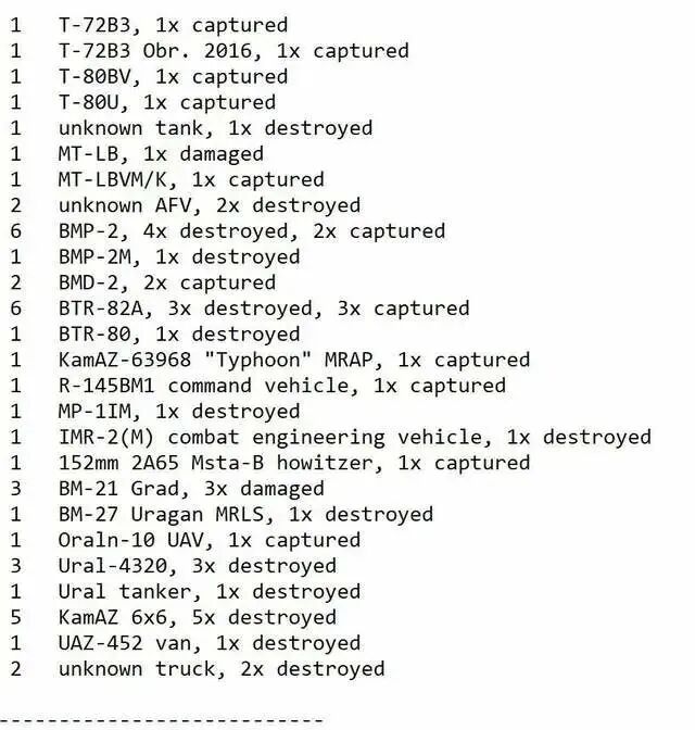 除了巨大的人员伤亡之外,昨天有图像证明的俄军装备损失又创了近期新高,共计20辆装甲车/步战车和5辆坦克,其中完好无损的落入乌军手里的有4辆坦克,8辆装甲车/步战车。