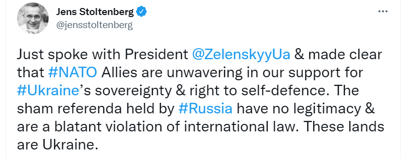与此同时,北约秘书长Jens Stoltenberg在和泽连斯基通话时,再次表示同盟国将会不遗余力地继续支持乌克兰,不会承认俄罗斯的公投。
