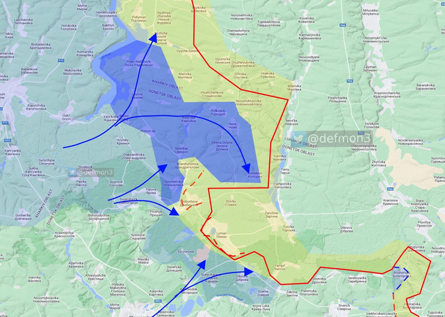 在库皮扬斯克方向,俄军可能已经开始向斯瓦托夫撤退,从皮斯基-拉季基夫斯基(Pisky-Radkivskyi,)前出的乌军先头部队,已经抵到了皮德利曼附近(见下图最上方蓝色箭头)。