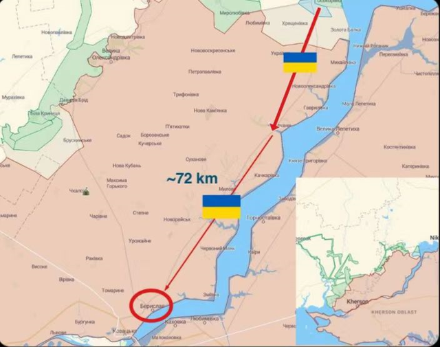 昨天,乌克兰武装部队在赫尔松东西两线同时发动了闪电战,西线占了赫尔松市附近的几个定居点,而东线乌军狂飙突进,沿着第聂伯河北岸前进了72公里,一口气解放了4个大型城镇和无数个小定居点。