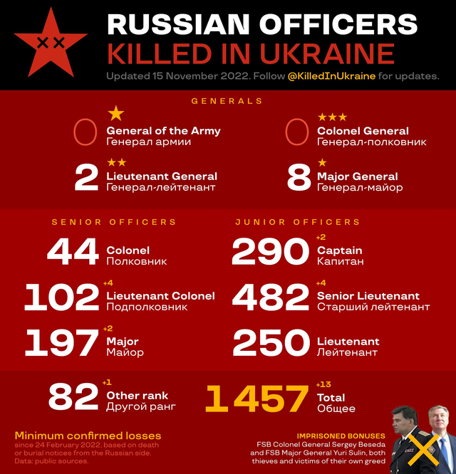 根据保守估计,截至目前,一共有1457名俄罗斯军官阵亡。