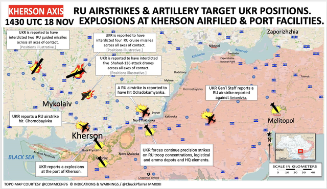 乌军则继续打击第聂伯罗河左岸的俄军兵力和装备集结地,乌总参谋部报告称,乌军昨天的远程打击,炸死了斯卡多夫斯克的50多名俄军人员,并摧毁了卓别林卡的一个俄军弹药库。