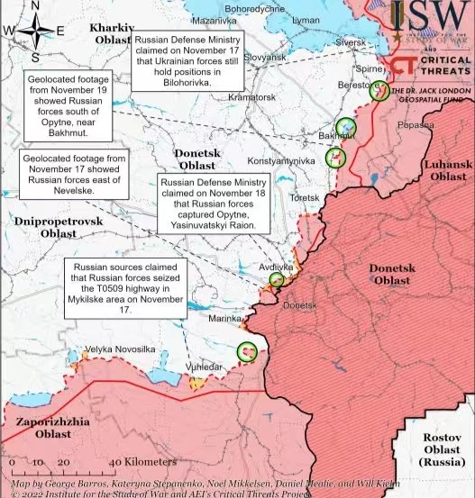 在顿巴斯地区,从10月底开始,俄军的重点似乎开始向南转移,除了在pavlivka的人肉攻势之外,皮斯基方向的攻势也有所增强,基本夺取了Opytne村,正在进攻Vodiane村。