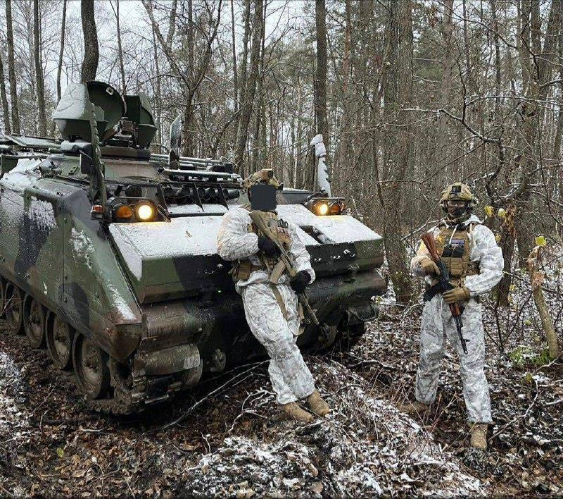 荷兰装甲运兵车YPR-765和乌克兰军队在前线某处遇到了第一场雪。