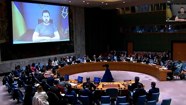 泽连斯基在联合国安理会的会议上发表讲话,呼吁该组织谴责对乌克兰能源基础设施的导弹袭击,他说: