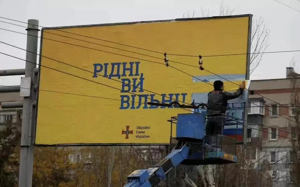 赫尔松广告牌的俄语“广告”被涂掉,换上了新标语: