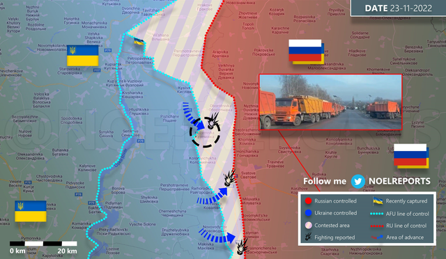 俄罗斯继续向斯瓦托夫轴心运送增援部队和更多的建筑材料,以加强防御,但乌军在此方向优势明显,仍然非常有可能在年底前将俄军击退至2月24日的出发线。
