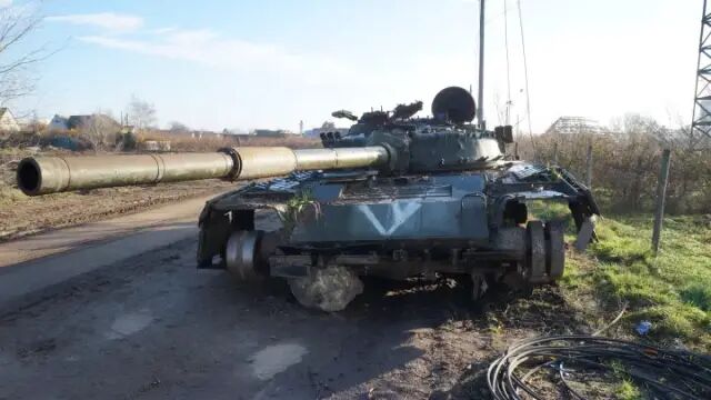 在一个未知的地点,发现了一辆俄军T-80BVM的残骸,这辆坦克两侧履带不翼而飞,炮塔上的反应装甲也被拆掉了。