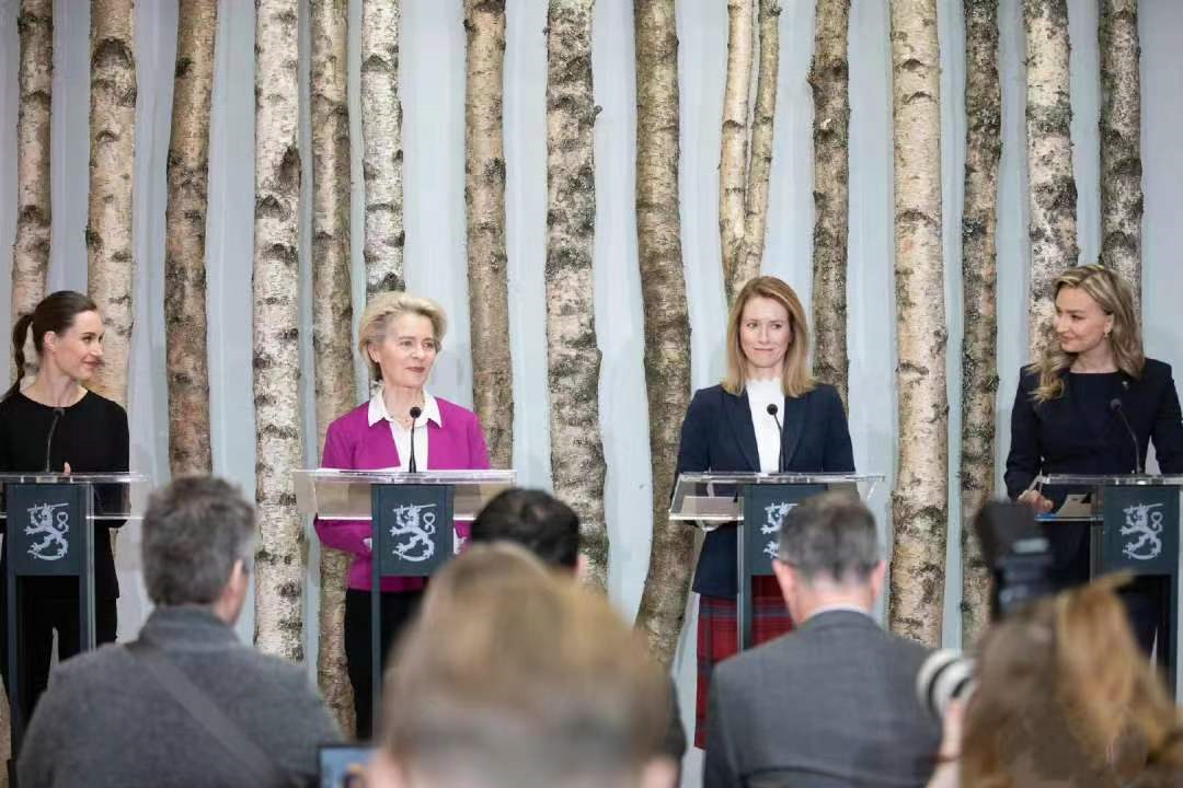 论坛上,四位自信的欧洲女性站在一起指点江山,讨论怎样更好的帮助乌克兰。