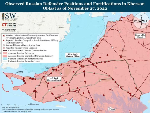下图是ISW绘制的俄军的最新放线图,包括堑壕、龙齿等等。