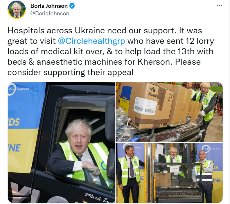 英国前首相约翰逊亲自开叉车,为乌克兰装载向赫尔松提供的医用物资和过冬物资。