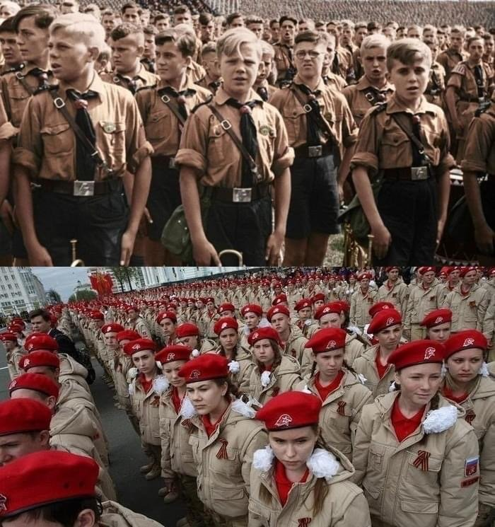 (上图为纳粹德国的少年团,下图为俄罗斯的学生)。