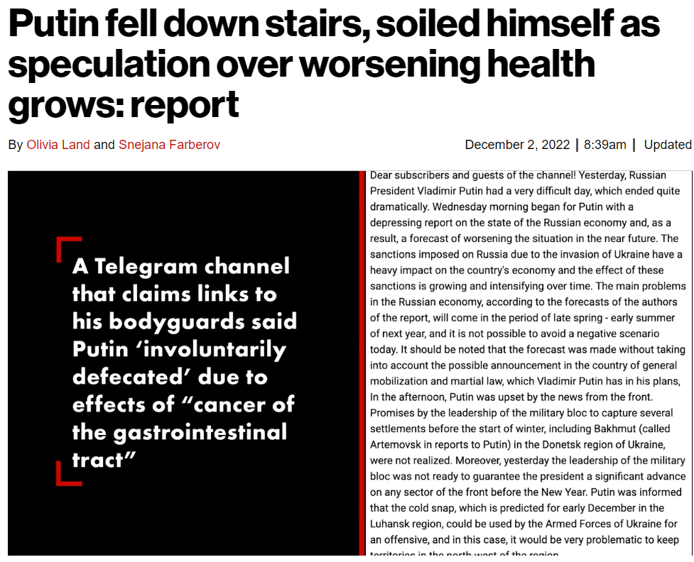 据传普京从楼梯上摔下来,并触发大便失禁。