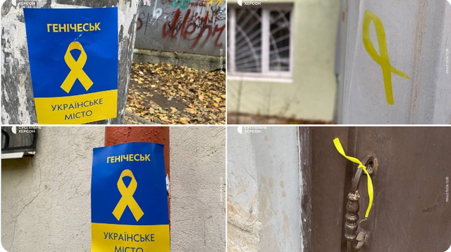 此外,在Henichesk,民众继续反抗俄罗斯占领当局,“黄丝带”运动的蓝色和黄色符号和明信片出现在城市的街道上——这通常是当地即将解放的一个信号。