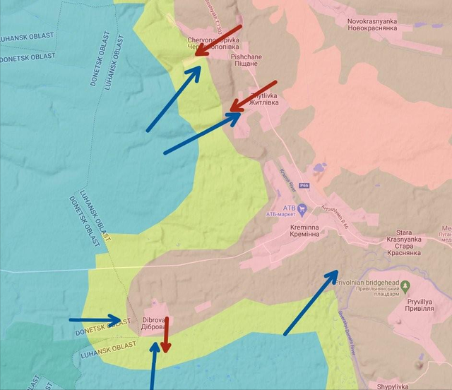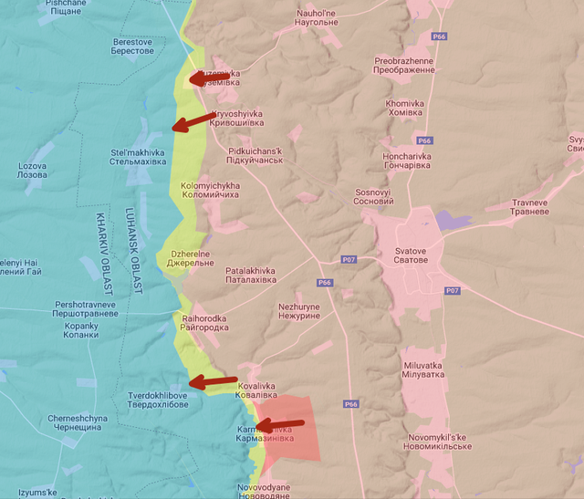 在斯瓦托夫方向,俄军正试图将乌军推回Zherebets 河以西,他们似乎在Karmazynivka取得了一定的成功。