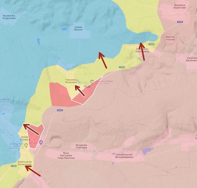 在北路,俄军的进攻也终于取得了可以确认的结果,有证据显示,他们已经占领了苏勒达尔(Soledar)东北面T-13-02公路沿线的Yakovlivka镇。