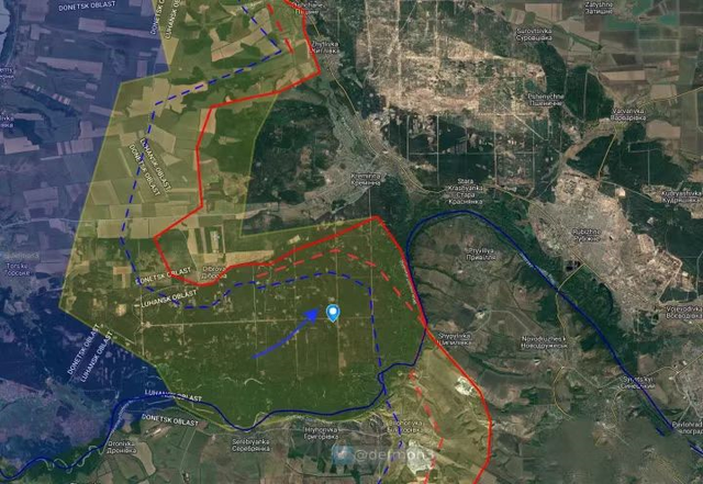 在斯瓦托夫以南,根据照片定位,乌军在克里米纳西南森林中持续取得进展,目前距城区仅5km。
