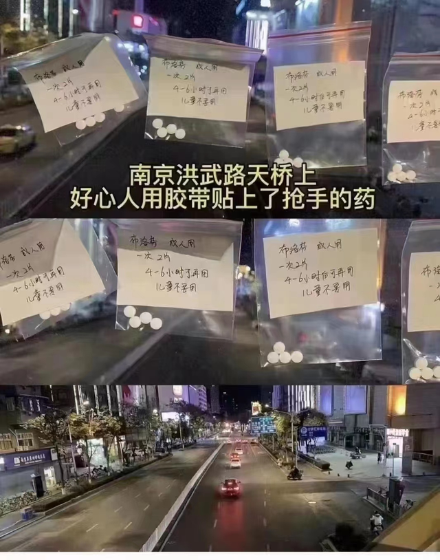南京市民在洪武路的天桥上,用胶带沾上布洛芬等紧缺的药品,供有需要的人取用。