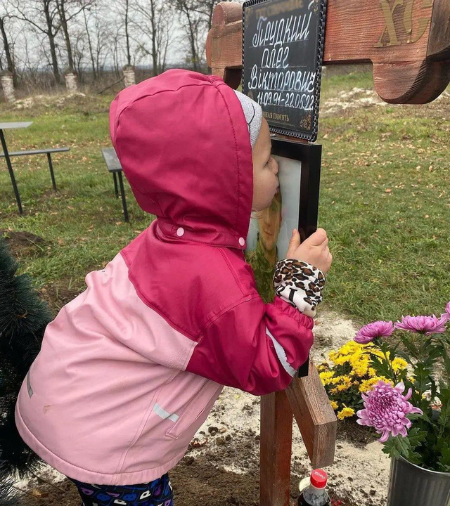 一位乌克兰小女孩正在亲吻墓牌上父亲的相片。