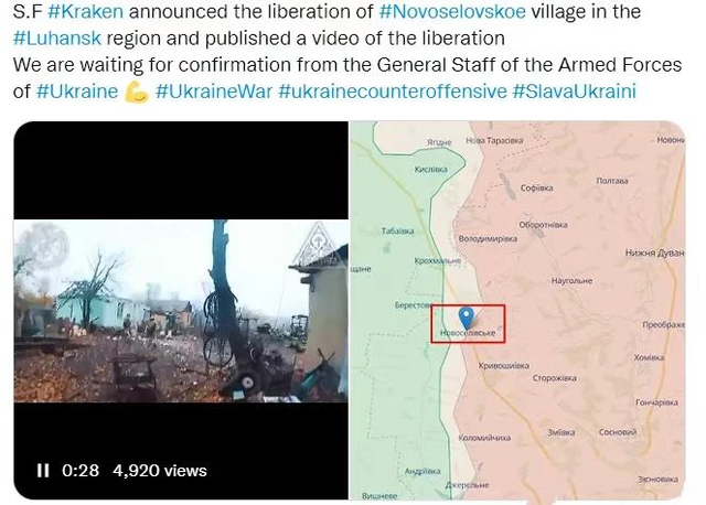 在斯瓦托夫方向,乌克兰海妖特种部队 宣布解放了Novoselovskoe (新沃舍洛夫斯科耶)村,并发布了一段解放视频。