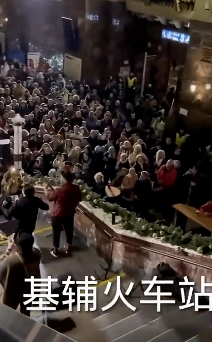 在基辅火车站内躲避空袭的人们,搞起了新年音乐会。