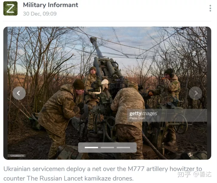 乌军为防俄军“手术刀”无人机在M777榴弹炮上设置阻拦网。