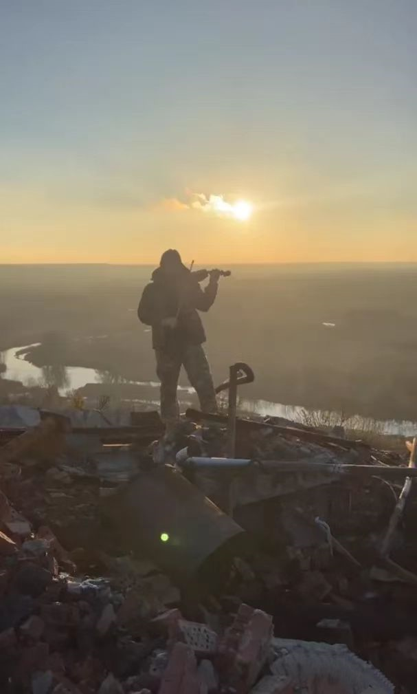 在伊久姆的废墟上奏响小提琴的乌克兰士兵。