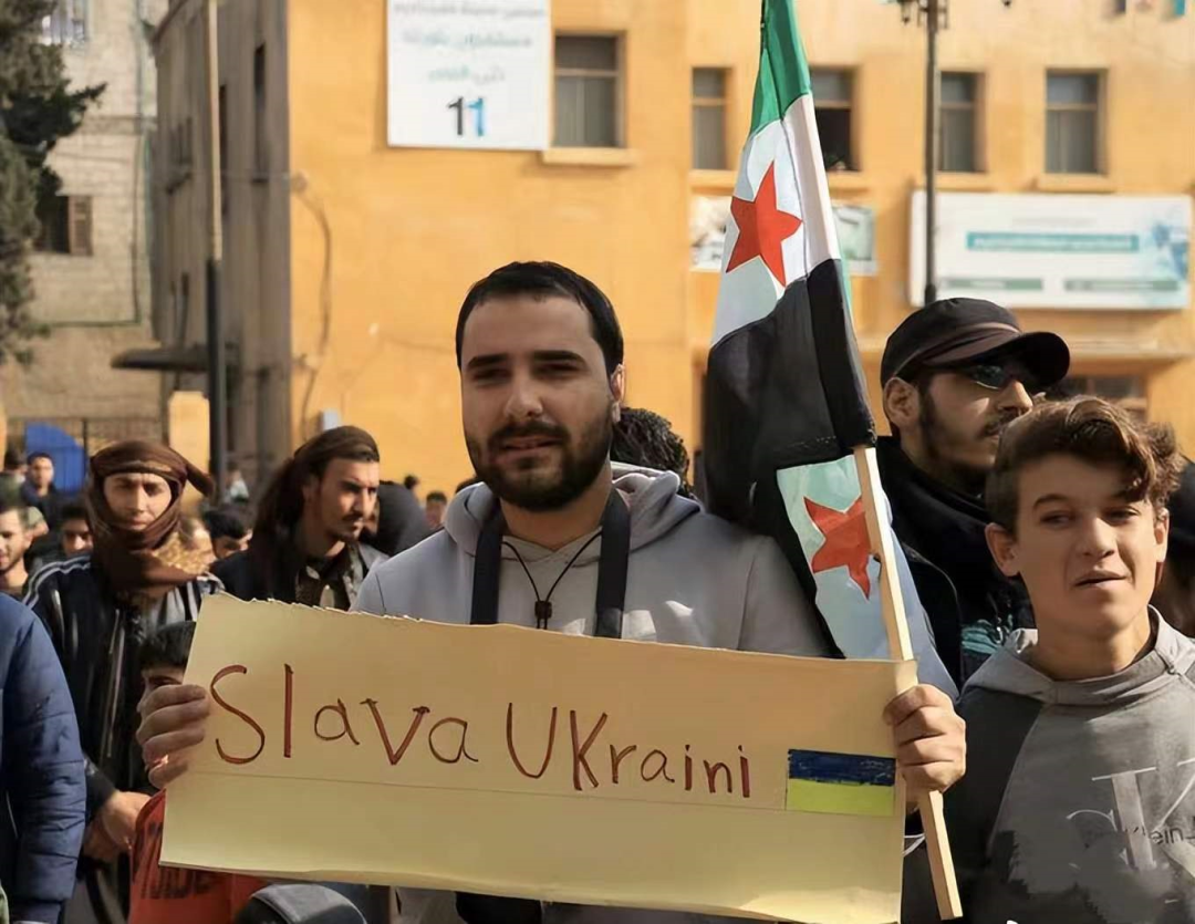 一个叙利亚人手拿着“荣耀归于乌克兰”的标语。