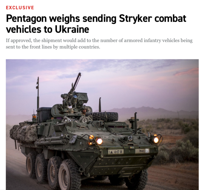 美国《政治报》援引两位知情人士的话,称美国正在考虑在即将到来的援助计划中向乌克兰派遣“史赛克”装甲战车。