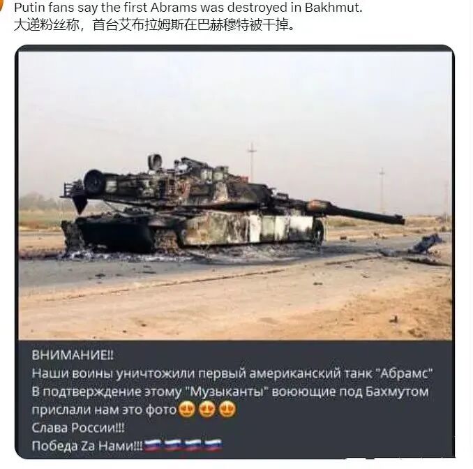 俄友宣布,首台援乌美国主战坦克M1A2艾布拉姆斯在巴赫穆特被击毁。