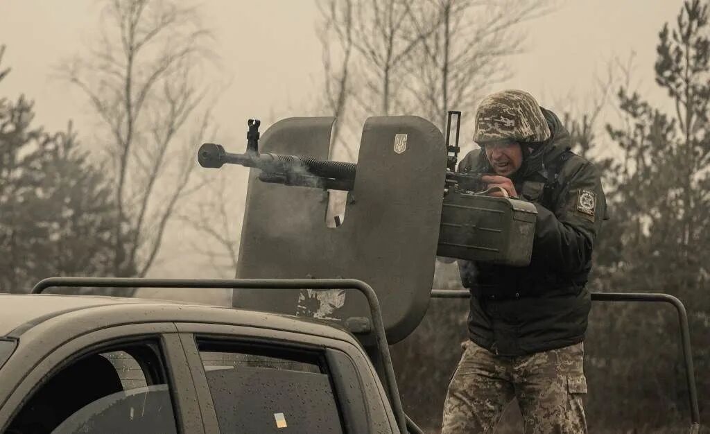 可见乌军使用车载的 DSHKM 12.7mm 重机枪与 AT-4 反装甲火箭。