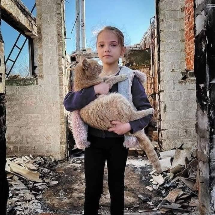 一位乌克兰小姑娘在已经变成废墟的家门口淡定拍照。