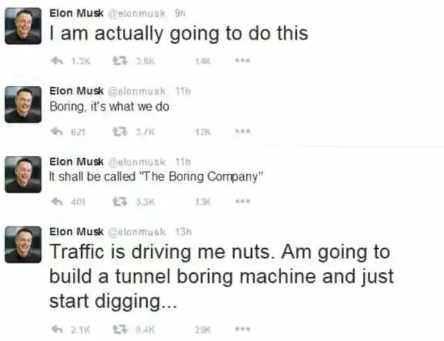 大意是说,这破交通把老子逼疯了,我要造一台挖孔机,开挖挖隧道。嗯,干这个事儿的公司,就叫它“无聊的公司”吧。我要开干了!(boring 除了无聊,还有钻孔的意思)。