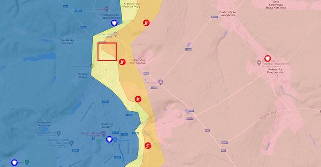 在巴赫穆特南部,仍然没有证据显示俄军已经占领了Klischiyivka以西的高地,不过他们已经从西面绕过高地、沿着运河向北,正在进攻Ivanivske以西Charsiv Yar以东的森林地带。