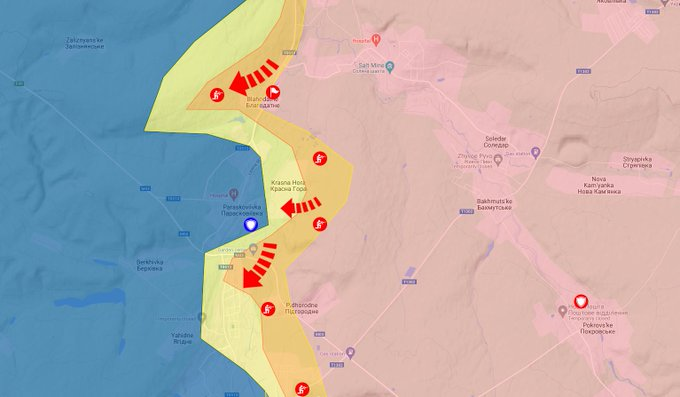 在巴赫穆特以北,俄罗斯军队昨日从Blahodatne向西推进,并取得了一些成功。这一路俄军的目的是切断通往斯拉维扬斯克的高速公路,并包围Paraskoviivka。