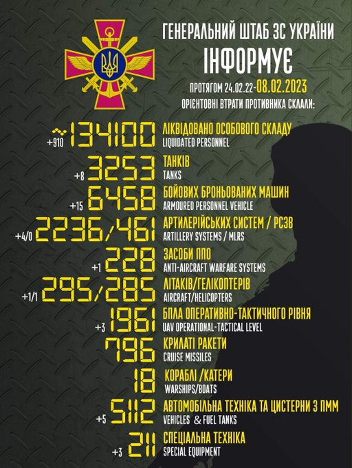昨日俄军新增阵亡到达了惊人的910人,并有8辆坦克、15辆装甲运兵车、4门火炮、一架直升机,以及1架飞机(苏-25)遭摧毁。
