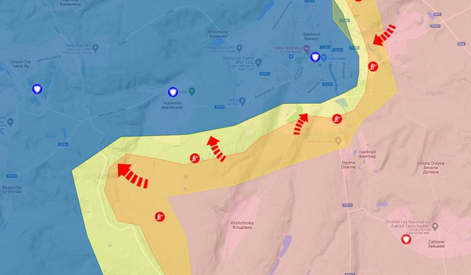 在巴赫穆特以南,大规模的战斗正在进行之中。瓦格纳在持续断的炮火支持下,向扼守T0504公路的Ivanivske推进。