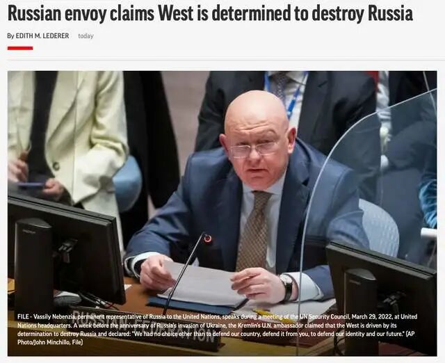 俄罗斯驻联合国大使称,西方正受到摧毁俄罗斯的决心的驱使,他说: