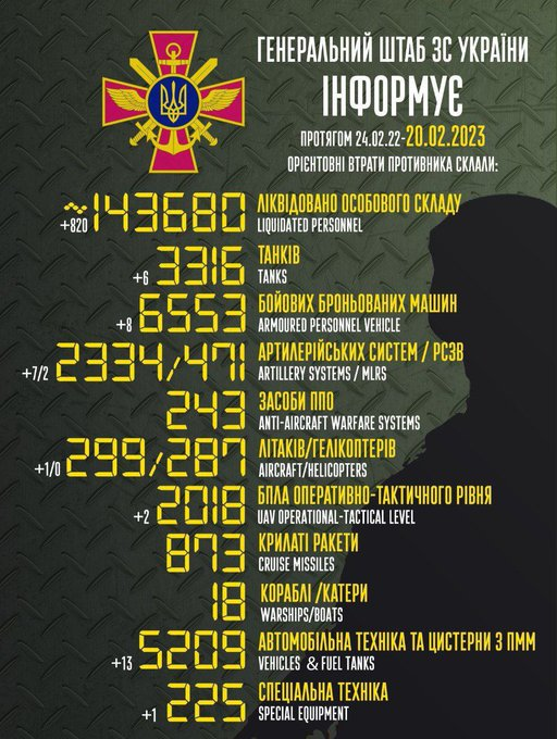昨日俄军在各条战线上共计减员820人,此外还有6辆坦克、8辆装甲运兵车、7门火炮、两套多管火箭炮,以及1架苏-25遭摧毁。