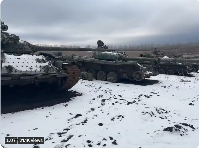 在俄罗斯别尔哥罗德B地区Biryuch村,有一堆被俄罗斯人毁坏了的军事装备:2辆T-80 BV,2辆 T-72B3,1辆 T-72B,1辆 BTR-82,2辆 BMP-2......