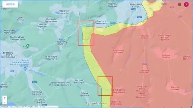 在巴赫穆特以南,俄乌两军昨日在 Stupochky 和 Ivanivske 之间,T-0504 以南近距离战斗。最激烈的战斗发生在下图上方红框区域,也就是十字路口处,俄军正在大举进攻。
