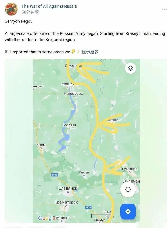 根据俄友的小道消息,俄军在南起莱曼,北至俄乌边境别尔哥罗德一线,发动了大规模攻势,局部最多向前推进了5公里。