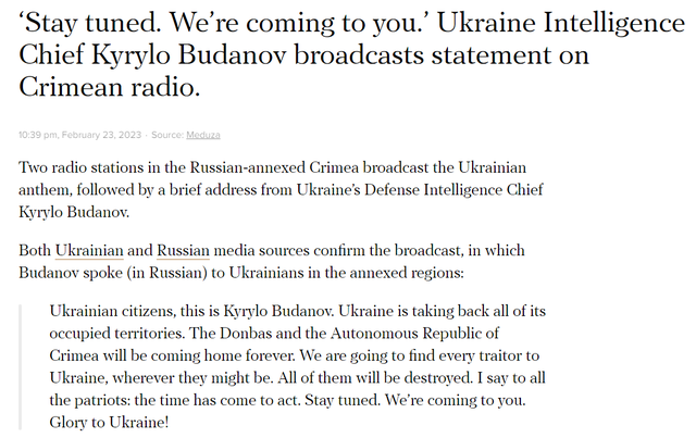 克里米亚、莫斯科、Krasnodar的部分广播电台上突然播放了乌克兰情报总长布达诺夫的讲话: