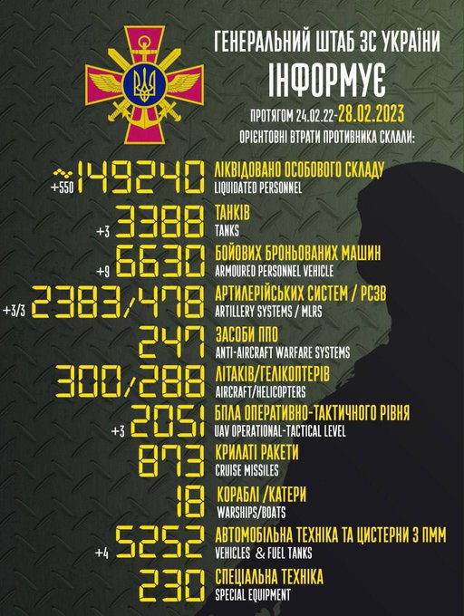 昨日俄军在各条战线上共计减员550人,此外还有3辆坦克、9辆装甲运兵车、3门火炮,以及3套多管火箭炮遭摧毁。
